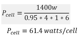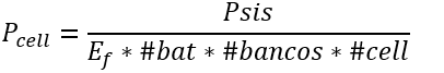 Con estos parámetros, podemos calcular la potencia necesaria que debe brindar cada celda (Pcell). Comenzaremos asumiendo que 1 banco de baterías (#bancos) es suficiente para el respaldo solicitado, caso contrario se debera aumentar la cantidad de bancos de baterías progresivamente.