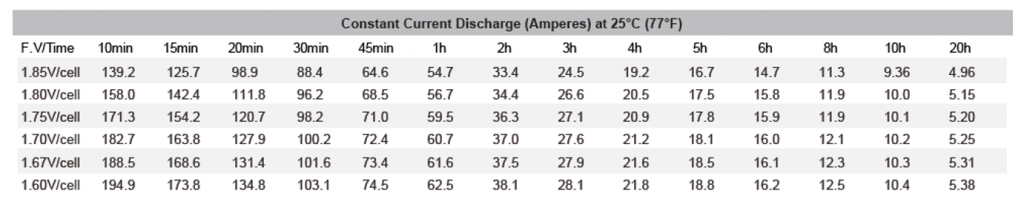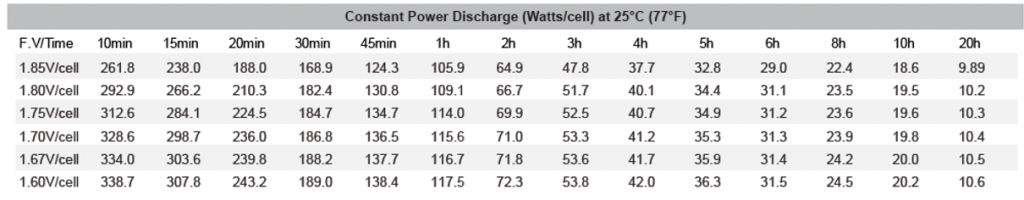 Y verificamos que según la hoja técnica la batería en 2 hora nos puede brindar 71W/cell, lo cual es mayor a la potencia que la carga necesita (61.4W/cell), por ende, se cumple el tiempo de autonomía requerida